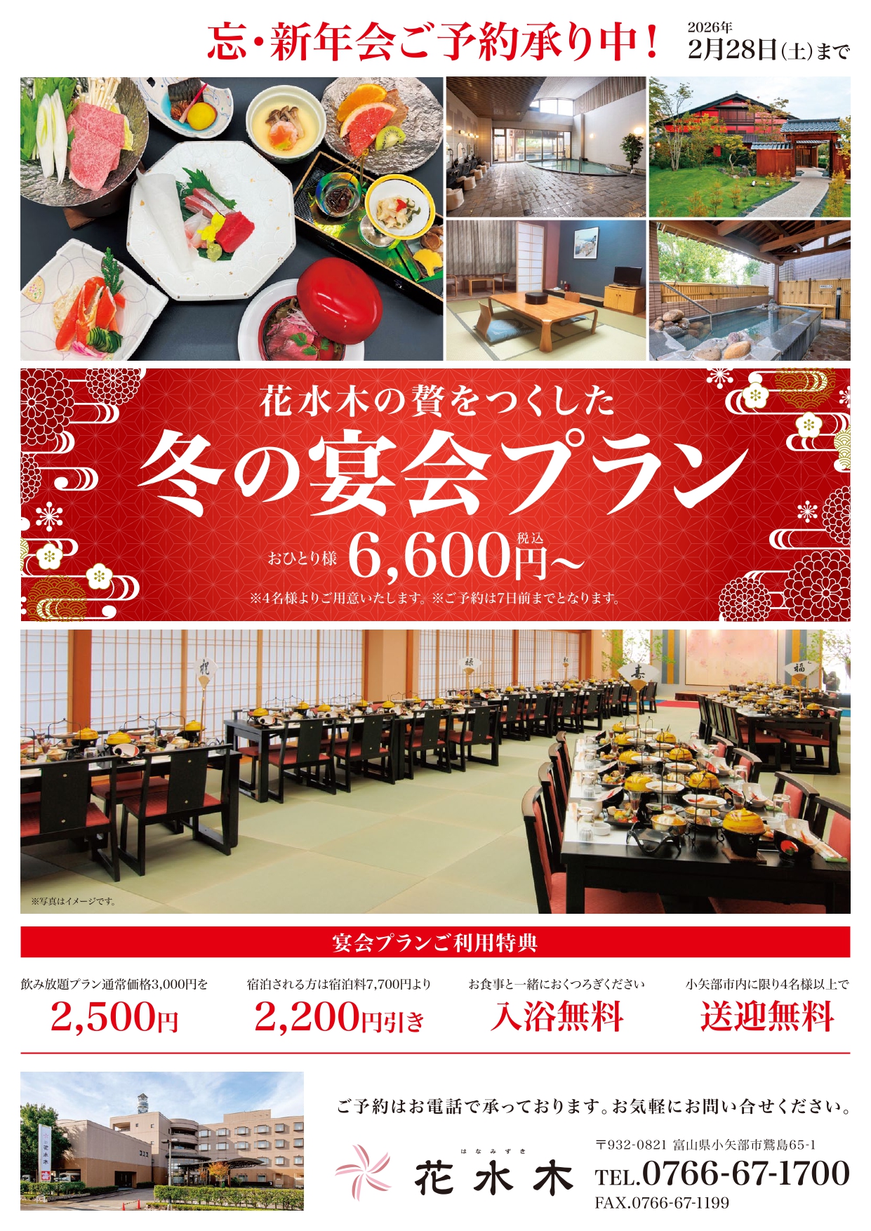これまでご愛顧いただいておりますご宴会、お食事、ご入浴に加え、宿泊につきましても皆様にご満足いただけるよう、より一層サービスの充実に努めてまいる所存です。